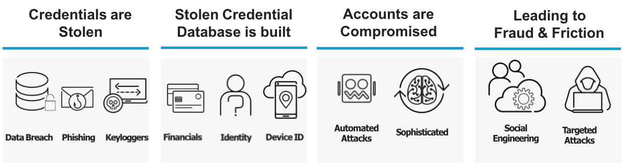 Let's walk through an example. Once credentials are stolen or acquired, cybercriminals use bots or other automated tools to attempt to create or access accounts. Thousands (or even millions) of attempts may be made. The success rate of credentials-based attacks hovers between 0.2%-2%. While these percentages may seem small, credential attacks do not need a high success rate because billions of credentials are available for free or at nominal cost.
