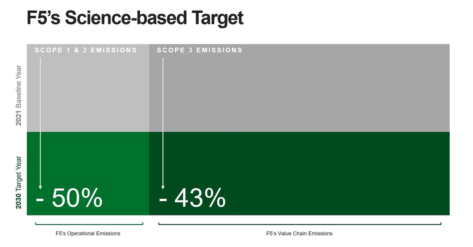 Now that the path we have in front of us to reduce F5’s environmental impact is clear, we are committed to a science-based target by 2030 from a 2021 baseline year that will: