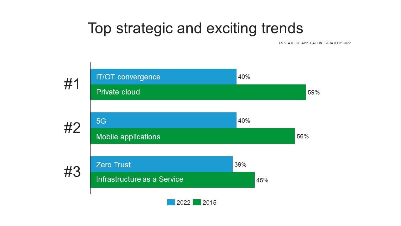 Eight years ago, the industry was in the early stages of digital transformation and the top strategic trends reported were private cloud (59%), mobile applications (56%), and SaaS (48%). This was in the early days of mobile applications transforming our lives, when we could use our phone to show our boarding passes—what a revelation not to have to print a ticket! Today, mobile apps have transformed the front-end experiences for every aspect of our lives, from ordering take out, signing up for classes, and scheduling personal appointments. But the future calls and organizations are now looking to the next horizon for digitizing not only the front end but optimizing back-end processes of the business, inclusive of finance, manufacturing, and all the functions that make an organization run. As a result, the number-one exciting trend this year is Information Technology (IT) and Operational Technology (OT) convergence, bringing the vast amount of manufacturing devices, sensors, and vehicles onto the network and transforming the way we do business. As the number-one answer at 40% of respondents, this is a dramatic 82% increase from 2015 when 22% of respondents reported Internet of Things (IoT) as a strategic trend.