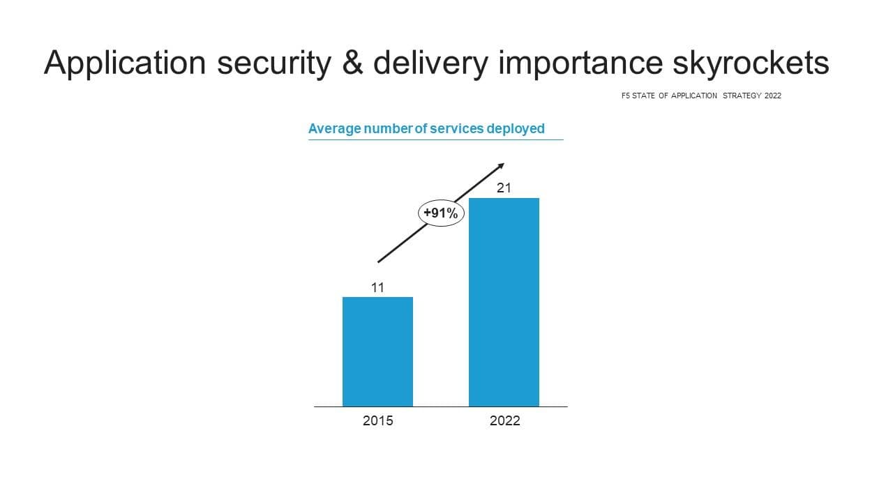As organizations mature in their digital transformation journey, application security and delivery technologies are emerging as a core capability in a digital world. The average number of technologies deployed increased 91% since 2015, from 11 to 21. We have learned that our most precious digital assets—apps—need a full range of helpers under the umbrella categories of performance, availability, security, and identity.