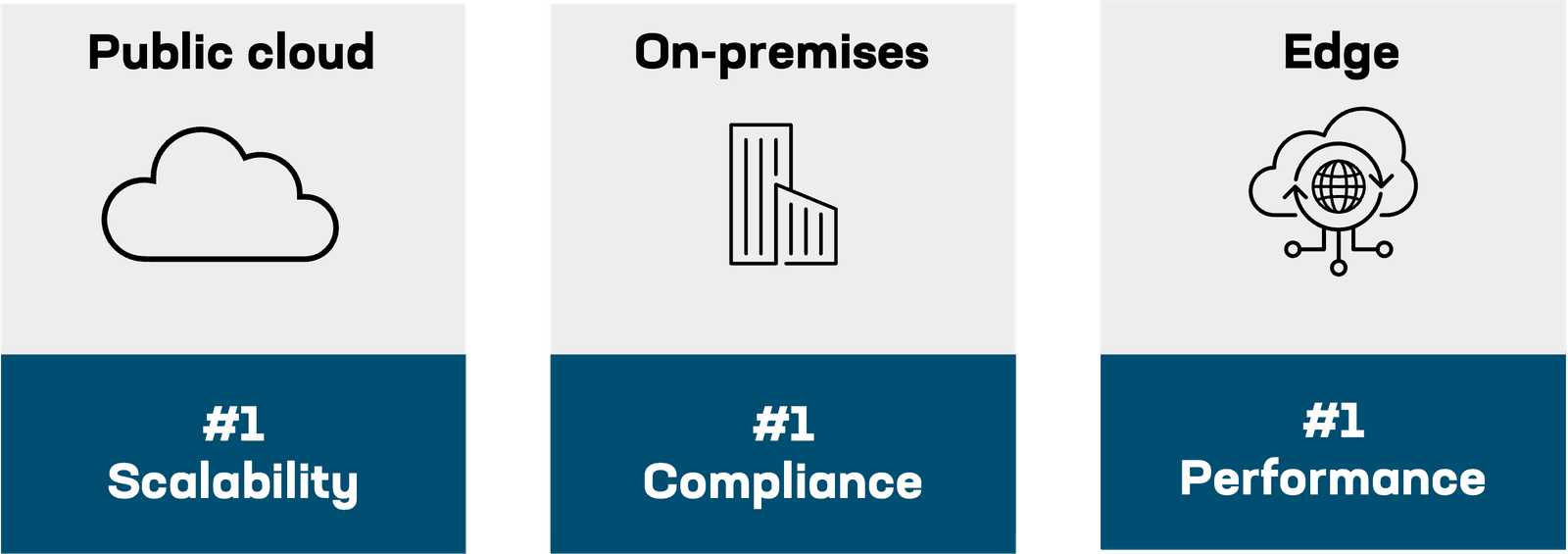 Public cloud is also chosen for speed to deploy, while ease of operations and proximity to data drive decisions toward on-premises. But interestingly, proximity to data also drives decisions toward edge computing, at least when paired with performance and scalability.
