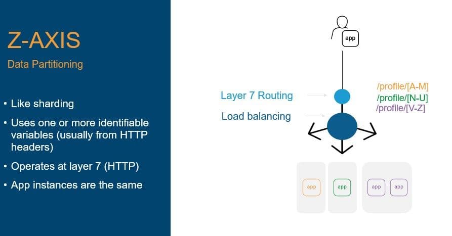 Very simply, there are three axes in the scale cube: x, y, and z. Each one maps to a load balancing architectural pattern. Each of those patterns is appropriate for meeting specific outcomes related to performance and availability given different types of applications and APIs.