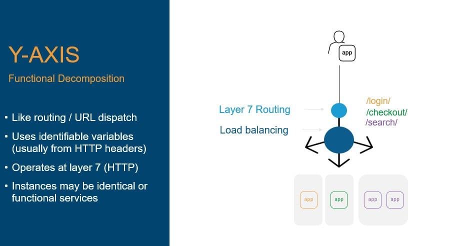 This pattern is based on functional decomposition and leverages the application layer (layer 7) capabilities of app delivery to scale based on functions rather than whole systems. The y-axis pattern is the first pattern in which layer 7 routing becomes a key tool in the app delivery architecture toolbox.