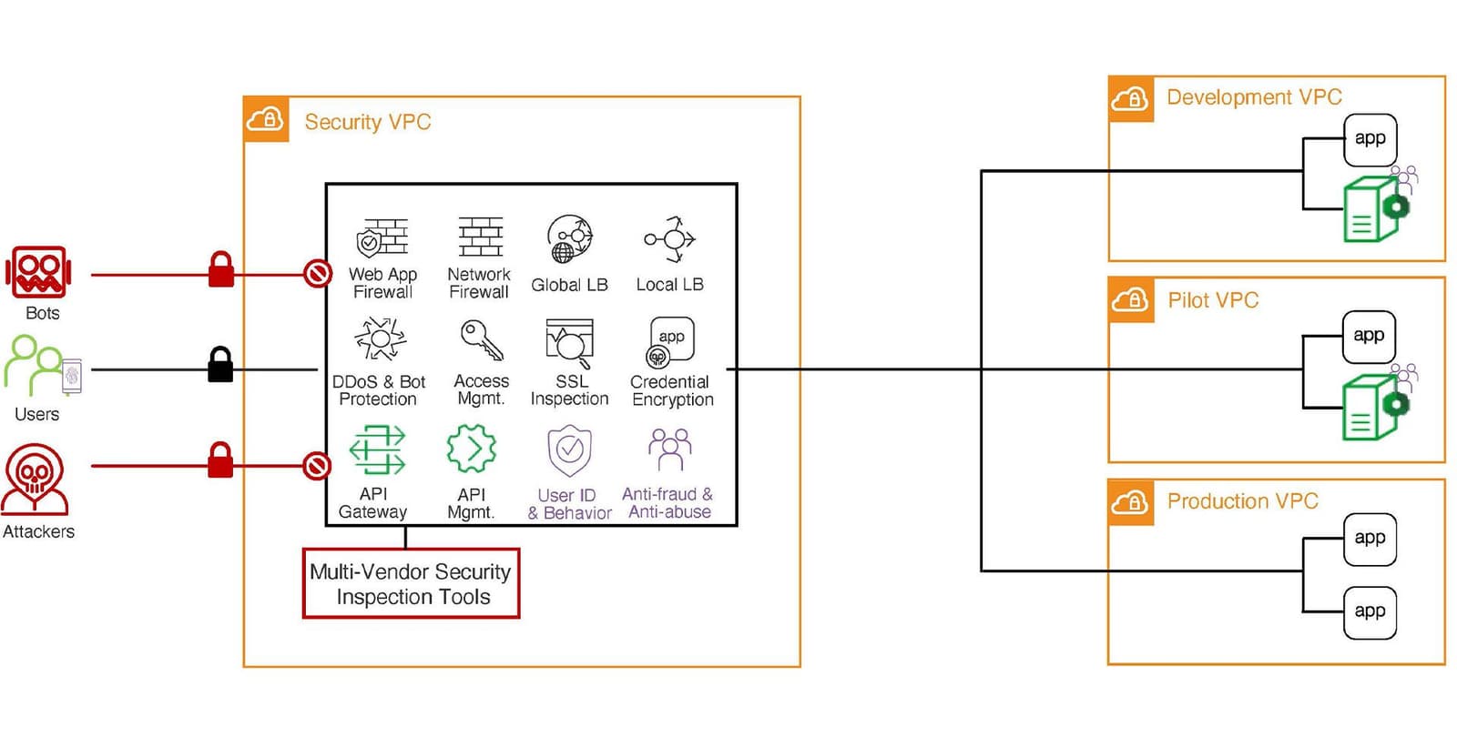 In a scenario like this, the Security VPC can be responsible for many critical—and often resource-intensive—capabilities, including load balancing, WAF (and other firewalls), access management, credential encryption, SSL inspection, DDoS and bot protection, API management, performance management, and others.