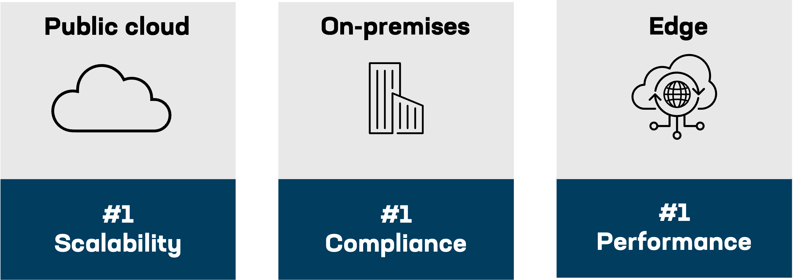 Public cloud is also chosen for speed to deploy, while ease of operations and proximity to data drive decisions toward on-premises. But interestingly, proximity to data also drives decisions toward edge computing, at least when paired with performance and scalability.