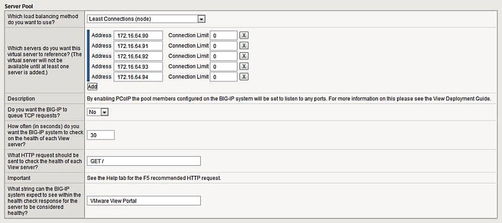 o simulate a real-world deployment of a virtual desktop infrastructure (VDI), configuration included two separate virtual desktop pools, one to allow access via PCoIP and the other to allow connections via Microsoft Remote Desktop Protocol (RDP). The purpose was to demonstrate local user connections to a virtual desktop environment via both protocols. The second phase of testing validated remote user access to the VDI environment via BIG-IP APM. In both scenarios, BIG-IP LTM provided basic traffic management and load balancing of the View Connection Servers.