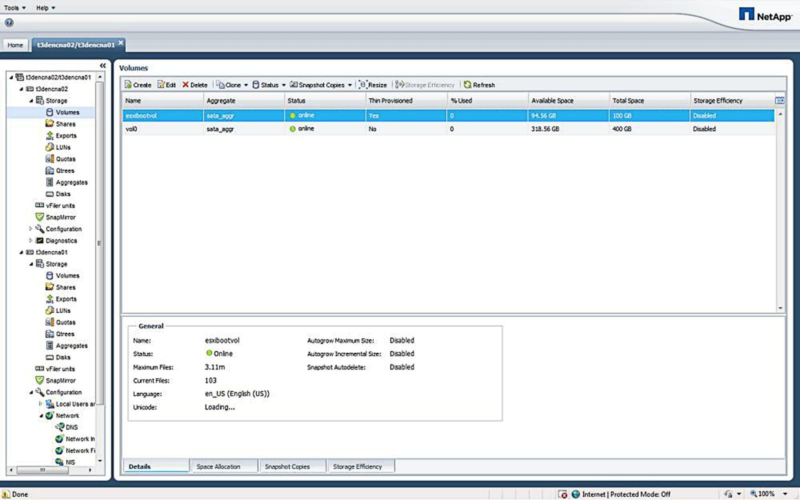 Two NetApp 3240 controllers were configured with separate disk technologies on each host. The first controller was equipped with a single shelf of 600 GB, 10,000 RPM, SAS disk storage with 22 disks in a single aggregate. The second controller was attached to the 1 TB SATA storage, which was used to provision SAN storage for the ESX servers. The higher performance SAS storage was provisioned for the virtual desktops via NFS to ensure adequate performance for access to remote desktops. To further accelerate performance, Flash Cache was enabled on the second controller. A simple command-line interface (CLI) command on the NetApp controller activated and deactivated Flash Cache.